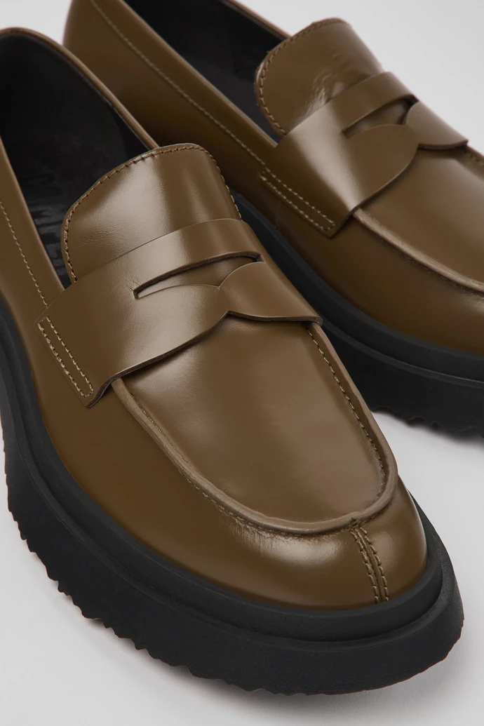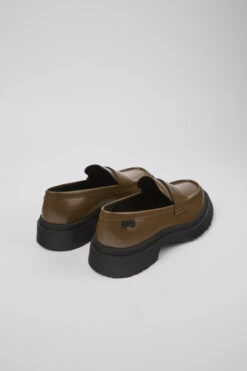 Brown leather women’s loafers with OrthoLite® Recycled™ removable footbeds and rubber outsoles.