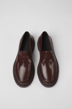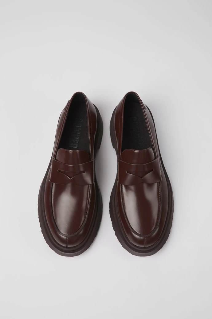 Burgundy leather men’s loafers with OrthoLite® Recycled™ removable footbeds and rubber outsoles.