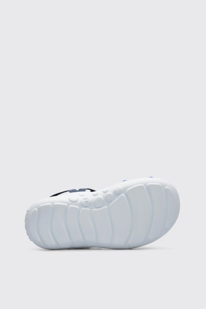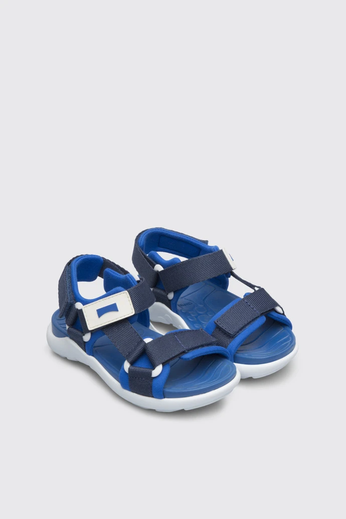 Blue sandal for kids. Fabric upper, with straps and velcro. 20% white recycled rubber outsole.
