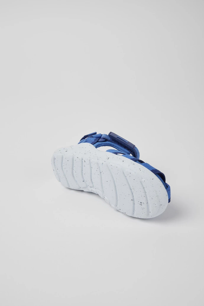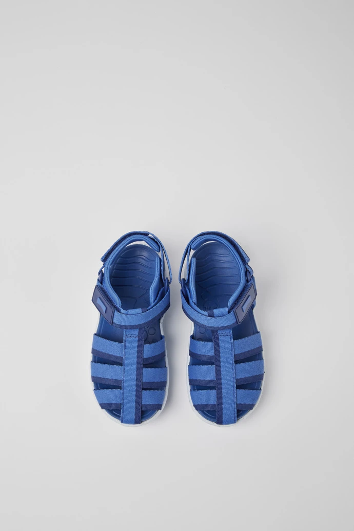 Blue coffee yarn kids’ sandals with recycled PET webbing, hook-and-loop closing system, and 100% rubber outsoles (20% recycled).