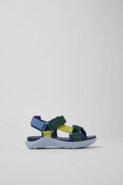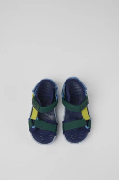 Multicolored textile kids’ sandals with OrthoLite® Recycled™ removable footbeds and rubber outsoles (20% recycled).