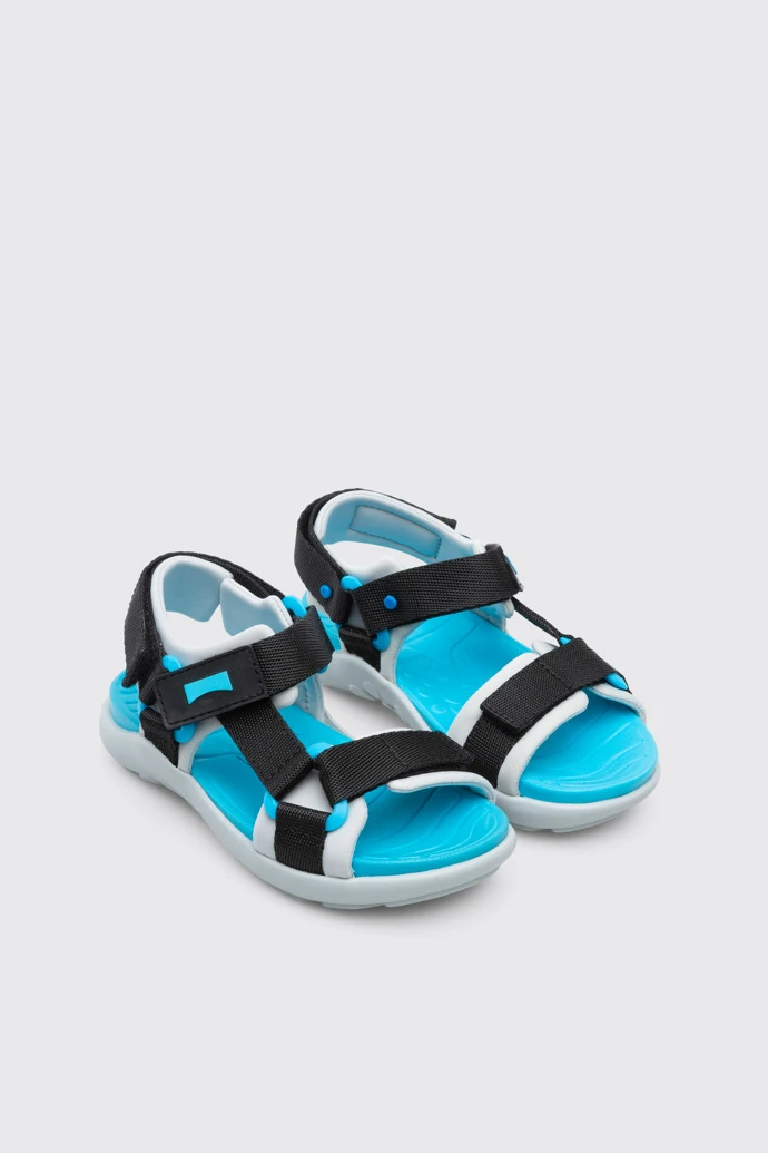 Kids’ multi-colored sandal with rubber outsole and Velcro straps. Black and blue details.
